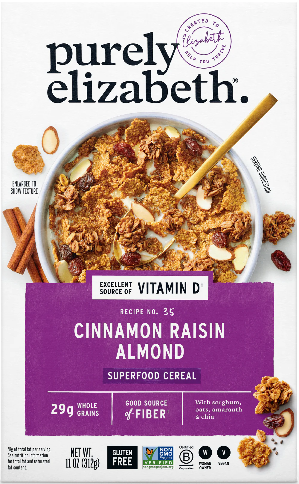 Sorghum, Organic Certified Gluten-Free Oats, Organic Coconut Sugar, Almonds, Organic Coconut Oil, Organic Raisins, Cinnamon, Sea Salt, Organic Puffed Amaranth, Vanilla Extract, Organic Chia Seeds, Organic Plant-Based Vitamin D3 (VegD3), Vitamin E (Mixed Tocopherols) Added to Preserve Freshness.
