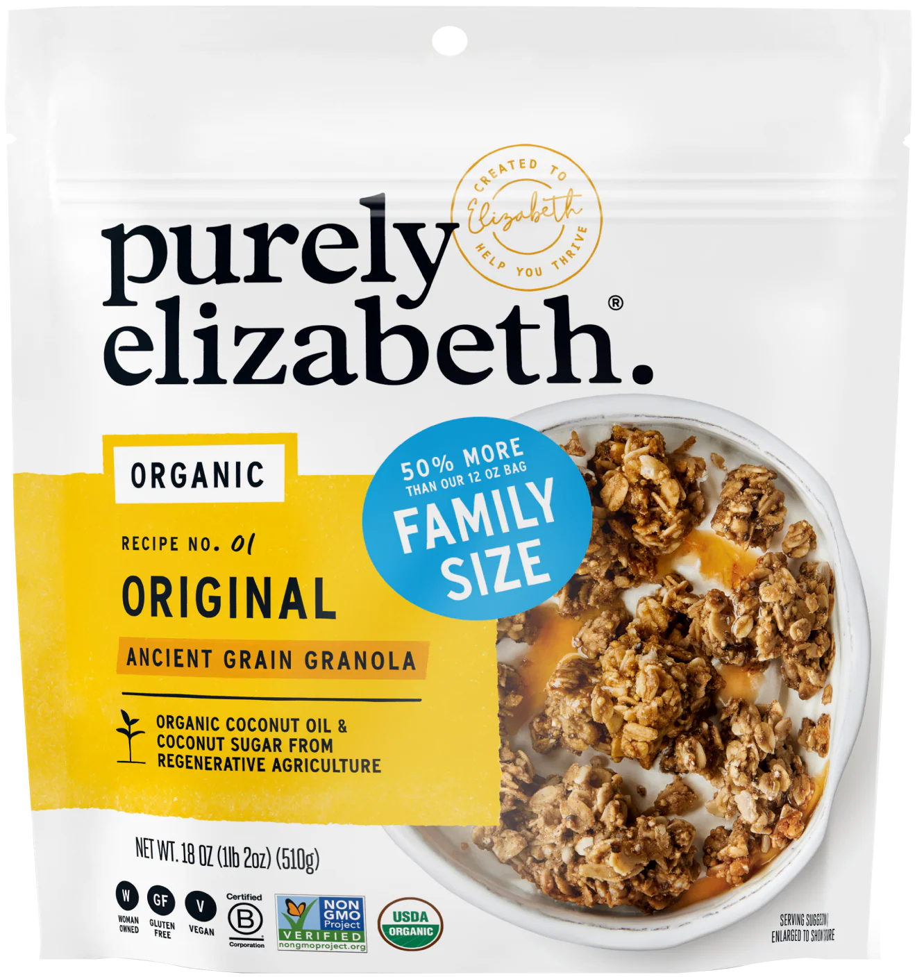 Organic Certified Gluten-Free Oats, Organic Coconut Sugar*, Organic Coconut Oil*, Organic Sunflower Seeds, Organic Puffed Amaranth, Organic Quinoa Flakes, Organic Chia Seeds, Organic Cinnamon, Sea Salt. *Regenerative Organic Certified